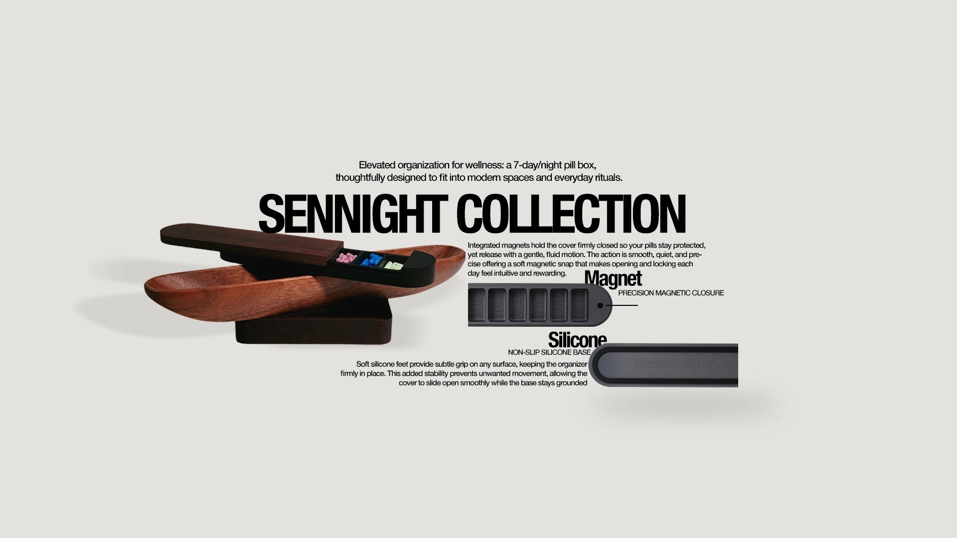 Inspired by the old English term for “seven nights,” SENNIGHT reflects thoughtful design for modern living. Just as the word evokes the passage of time, the collection reimagines the weekly rhythm with precision and intention—bringing balance, calm, and culturally tuned craftsmanship into everyday life. Crafted from premium materials and designed to live comfortably within your space, Sennight elevates the 7-day routine into an object of presence that feels intuitive, timeless, and considered. Extending this philosophy beyond the home, DAWN AND DUSK carries the same design language into a refined daily companion, designed for movement and daily carry, quietly supporting life in between moments. Together, SENNIGHT and DAWN & DUSK form a complete system—supporting your routine at rest and in motion, from week to day, home to everywhere, with intention, ease, and elevated simplicity.